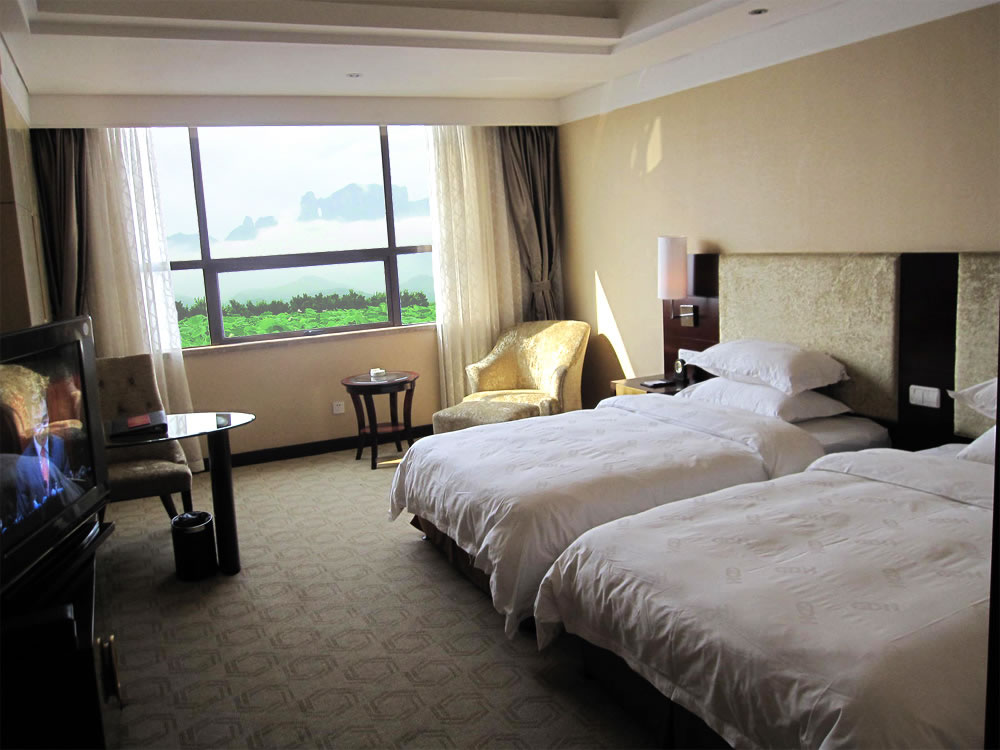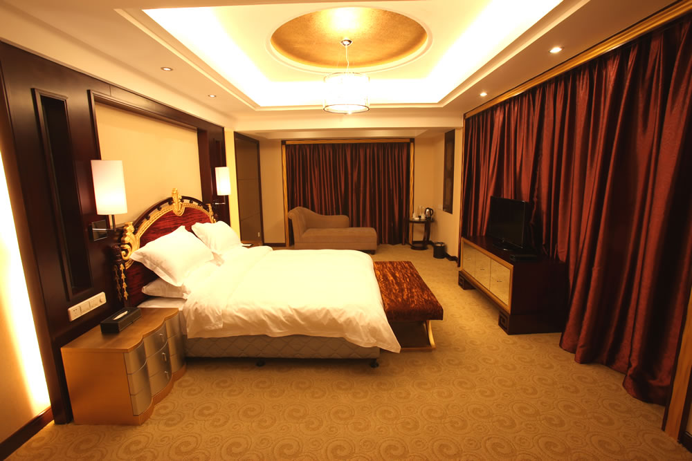 【豪華客房】(3—16 樓)):擁有各類豪華客房共380間/套,其中頂樓為皇室套房,有空中花園,可遠(yuǎn)觀天門山景區(qū)。