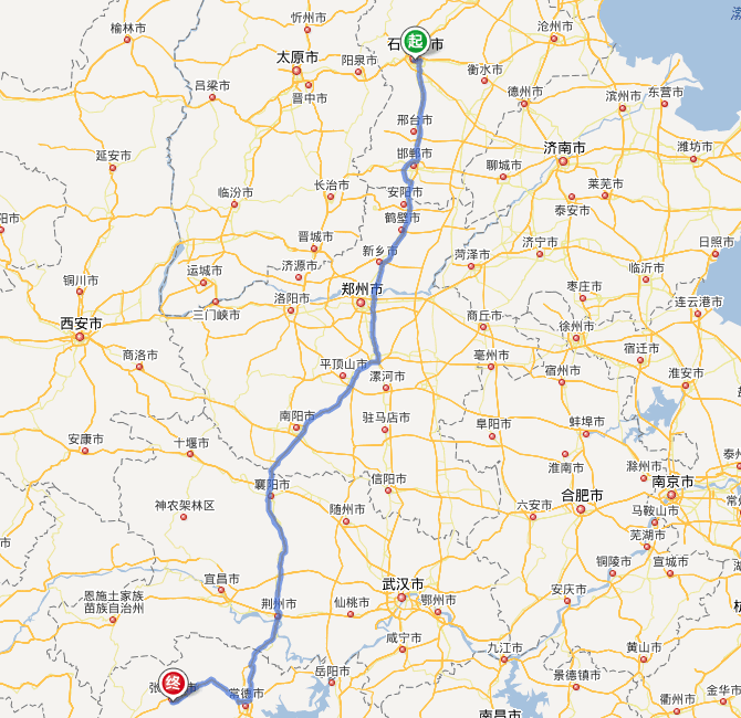石家莊到張家界自駕車(chē)路線地圖(距離最短)