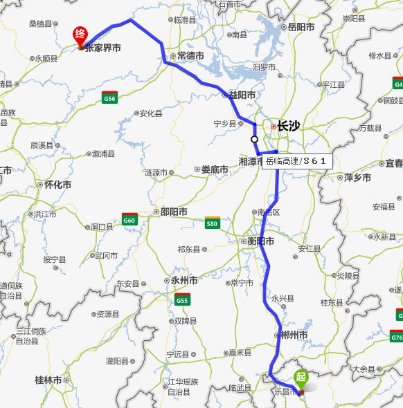 左右,沿途經過樂昌市——宜章縣——郴州市——耒陽市——衡陽市——湘潭市——寧鄉(xiāng)縣——益陽市——常德市——慈利縣——張家界。