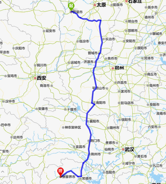 左右,沿途經過呂梁——榆社縣——長治——焦作——南陽——襄陽——荊門——荊州——常德(也可以走國道經澧縣、石門縣)——慈利——張家界。