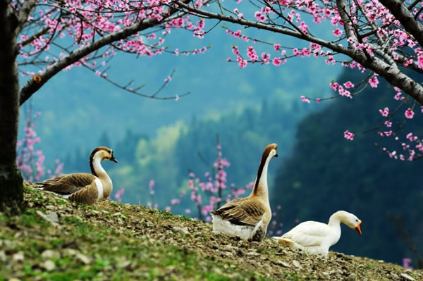 桃之夭夭,灼灼其華。據(jù)了解,天子山這處桃花仙境位于神堂灣至大觀臺之間的一農(nóng)場山丘內(nèi),面積足有一百畝以上。由于該地段剛好處于天子山至高點(diǎn),因此極目遠(yuǎn)眺,峰林風(fēng)光、桃花美景盡收眼底。而盡管農(nóng)場,則是一派鄉(xiāng)村田園風(fēng)情,一群雞鴨鵝不時穿梭在桃樹林內(nèi),一邊尋覓食物,一邊享受春光;看家護(hù)院的小黃狗迎接游客的熱情叫聲,讓人頓生回歸鄉(xiāng)愁之感。