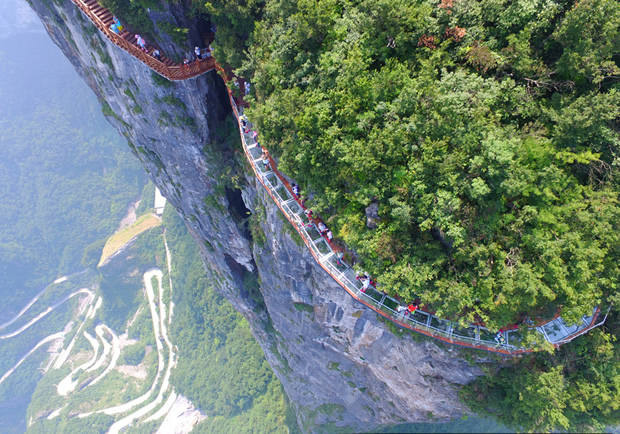 8月1日,天門山景區(qū)第三條玻璃棧道——盤龍崖玻璃棧道開通迎客。玻璃棧道全長(zhǎng)100米、寬1.6米,因站在玻璃棧道上能俯瞰天門山99道彎盤山公路而得名“盤龍崖玻璃棧道”。該玻璃棧道以其絕壁凌空的恢弘氣勢(shì)和令人頭暈?zāi)垦5囊曈X感受備受游客青睞。